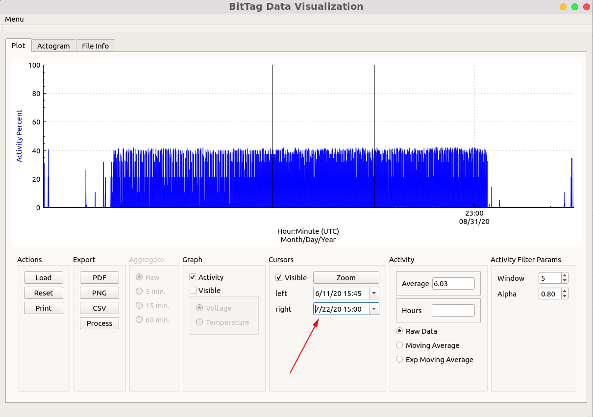 The BitTag visualization application (btviz) allows exploration of data files created using the BitTag monitor. The tool provides mechanisms to graphically explore data by “zooming” in on regions of interest, to visualize the data via actograms, and to generate graphics (png) files from the user defined graphs. In addition, the data exploration tool supports data aggregation and smoothing.